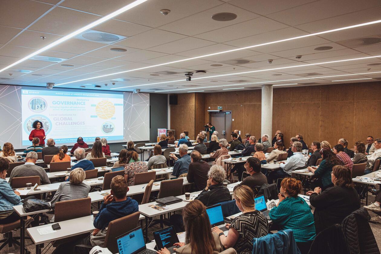 I 2019 fikk Nordhordland status som UNESCO biosfæreområde, og UiB – med UNESCO Chair Inger Måren og professor emeritus Peter Emil Kaland i spissen – var en stor bidragsyter i dette arbeidet. Peter Emil startet Biosfæredagen med å fortelle om hvordan Nordhordland kom på agendaen som aktuell kandidat for UNESCO biosfære-statusen – fra hans arbeid med Lindåsprosjektet på 70-tallet, opprettelsen av Lyngheisenteret på Lygra på 90-tallet, og videre til i dag. Ideen om å ansøke om UNESCO biosfære-status for Nordhordland kom på bordet allerede tidlig på 2000-tallet, for så å bli lagt til side i over ti år før saken kom på bordet igjen, og ble realisert gjennom mye hardt arbeid. Siden dette har biosfæreavdelingen hos Region Nordhordland vokst fra én til fire ansatte.