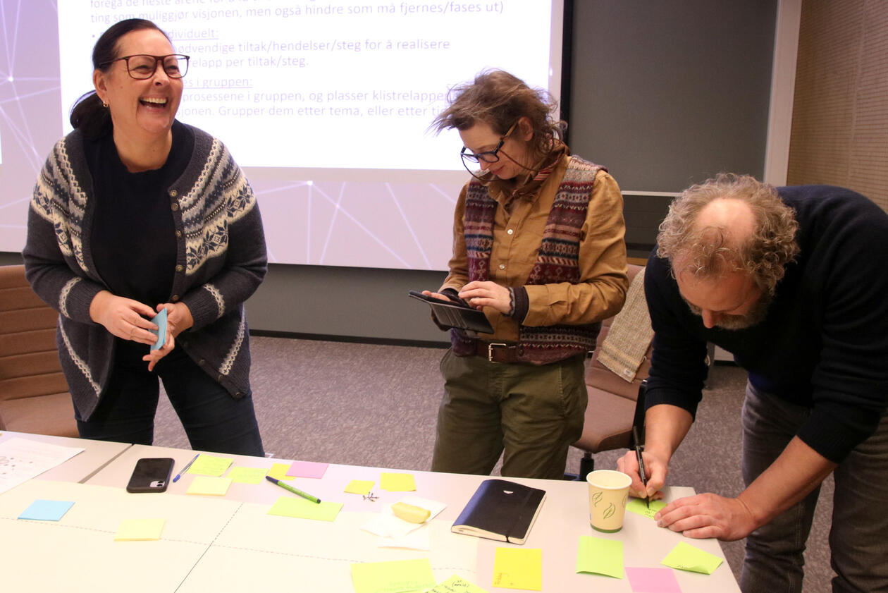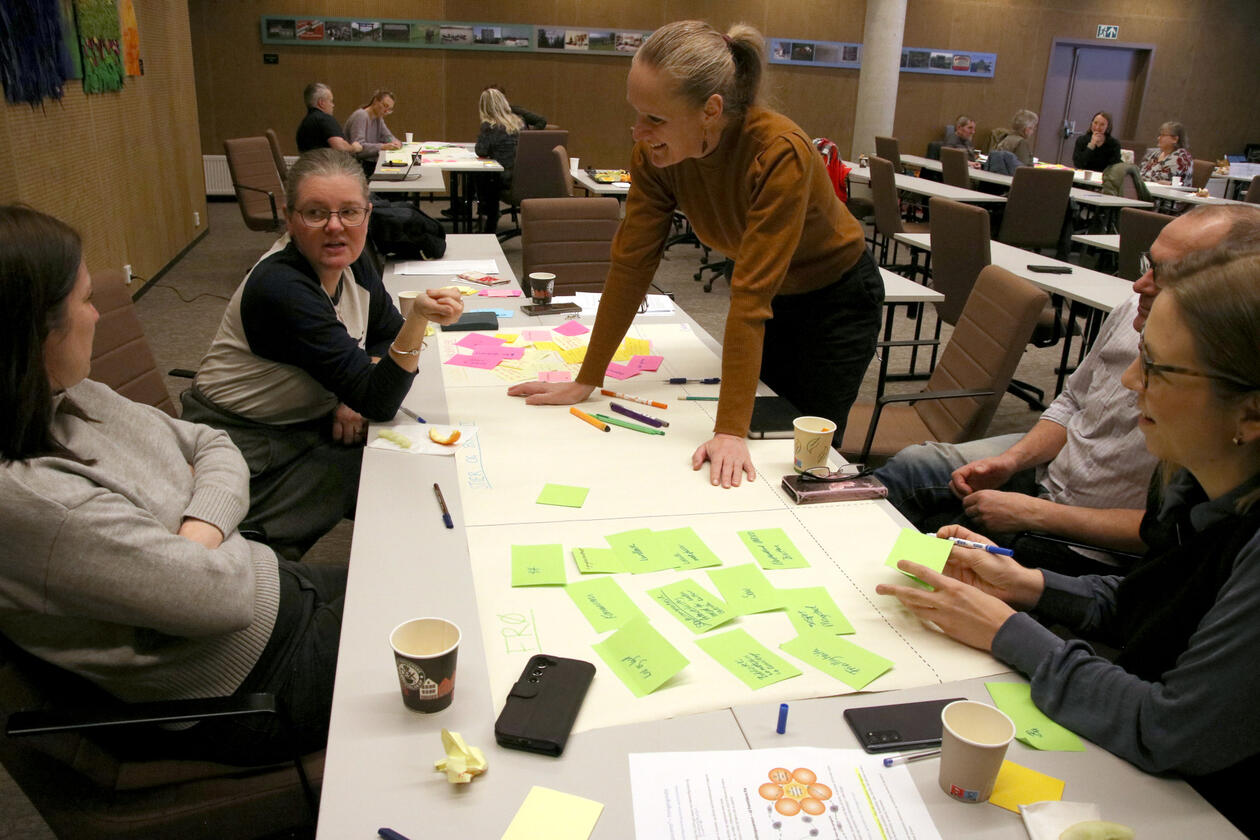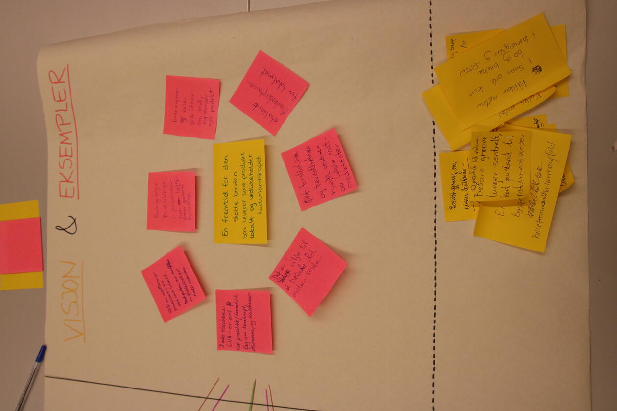 Different stakeholders within cultural heritage, agriculture and cultural landscapes, municipalities, and business from all municipalities in the Bisphere Reserve were invited to attend the workshop. On teh workshop day, we were 14 participants from four municipalities at Helsehuset in Knarvik, and we worked in four separate groups to create positive visions for Nordhordland. Inger Måren and Silje Östman from the CULTIVATE team (University of Bergen), and Kari Natland and Kjersti Isdal from the Biosphere Reserve team (Region Nordhordland) were there to guide the groups through the work with defining visions, seeds and pathways for achieving these positive visions.