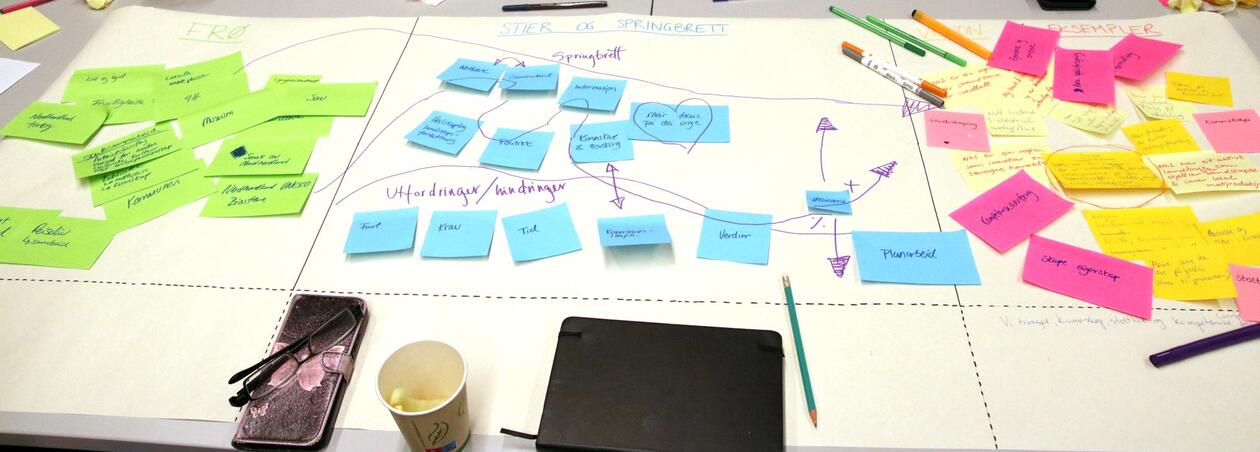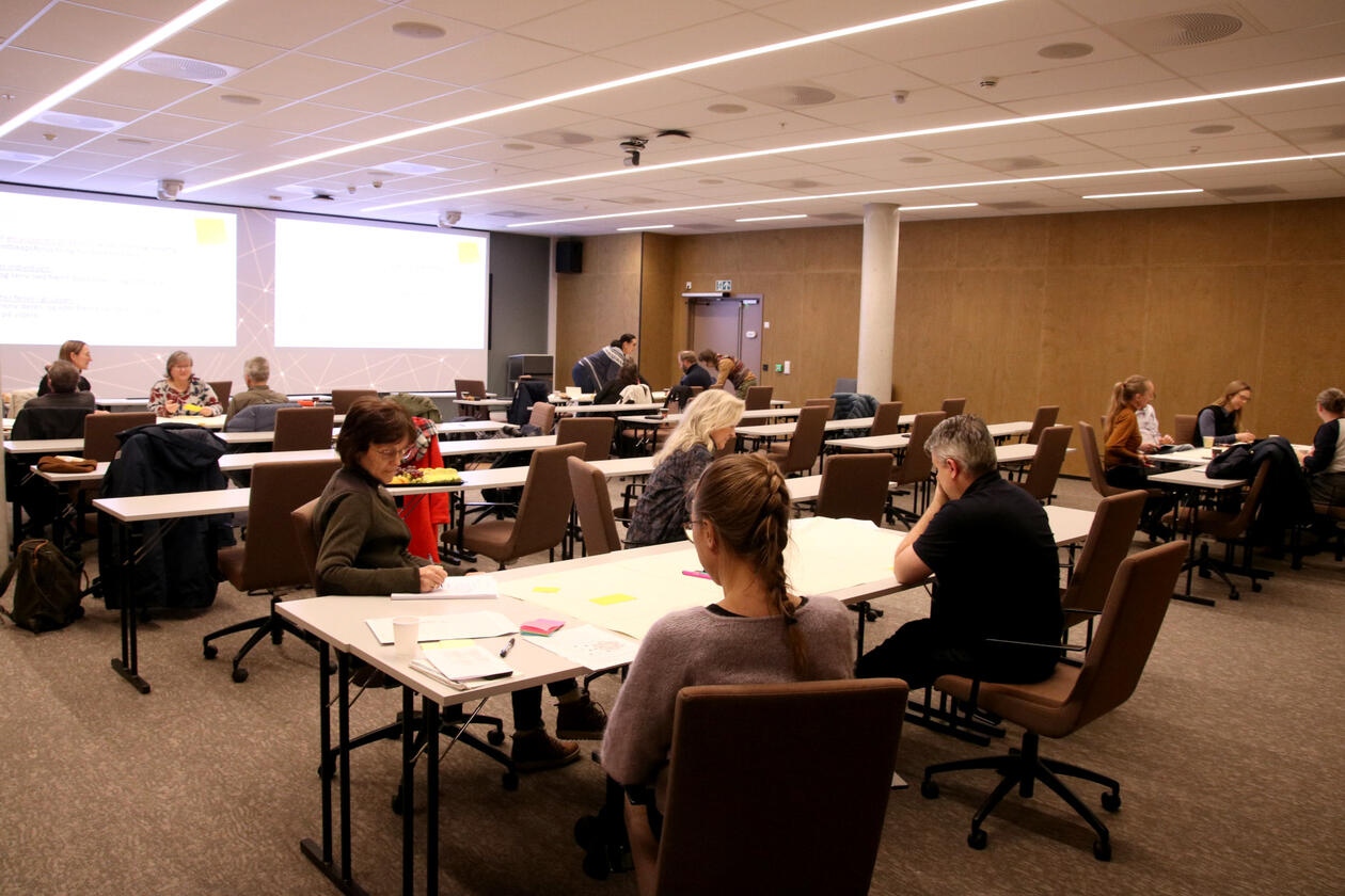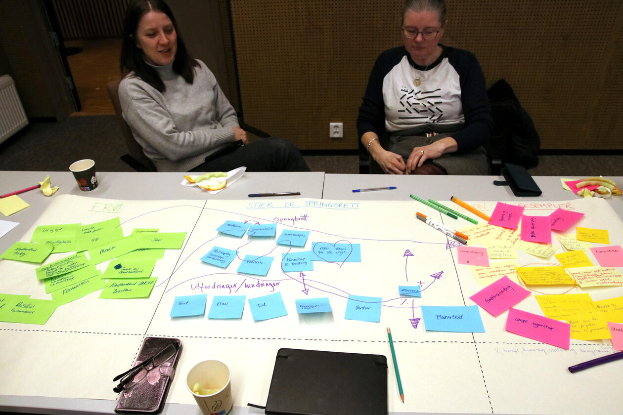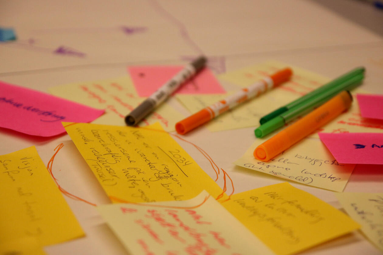 Different stakeholders within cultural heritage, agriculture and cultural landscapes, municipalities, and business from all municipalities in the Bisphere Reserve were invited to attend the workshop. On teh workshop day, we were 14 participants from four municipalities at Helsehuset in Knarvik, and we worked in four separate groups to create positive visions for Nordhordland. Inger Måren and Silje Östman from the CULTIVATE team (University of Bergen), and Kari Natland and Kjersti Isdal from the Biosphere Reserve team (Region Nordhordland) were there to guide the groups through the work with defining visions, seeds and pathways for achieving these positive visions.