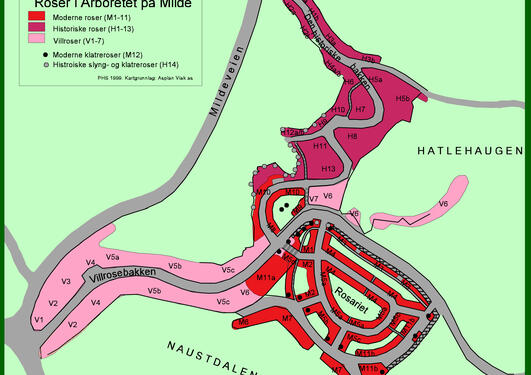 The Rosarium is divided into three parts: The Wild Rose Walk (Villroser; Villrosebakken) and the Historic Walk (Historiske roser; den historiske bakken), leading down to the Rose Garden (Moderne roser; rosehagen) with the modern roses.