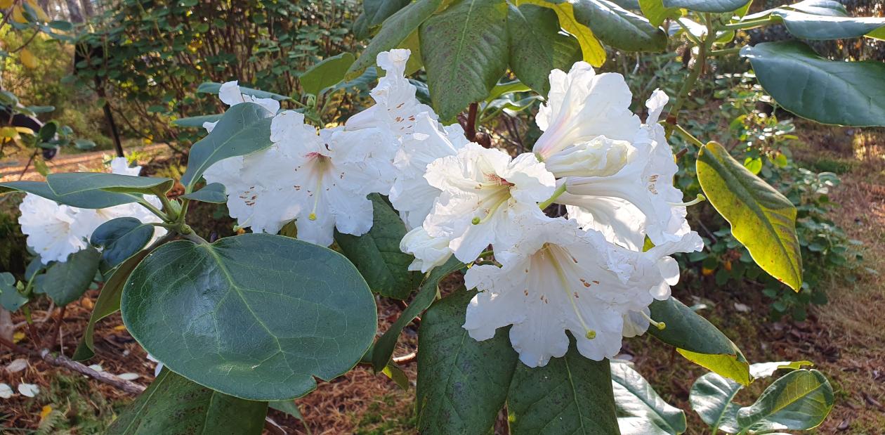 An even bigger surprise was the abundant flowering now in mid-October! It has produced plenty of big fragrant flowers. The flowers are very similar to Rh. auriculatum in both shape and size, but the scent of Rh. faithiae is even stronger.