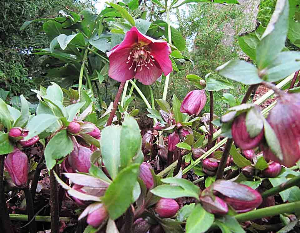 The mild autumnal weather we have had in 2011 has prompted this Christmas rose to flower already in late November, and it is now full of buds that will open up as soon as it gets milder over Christmas and onwards.