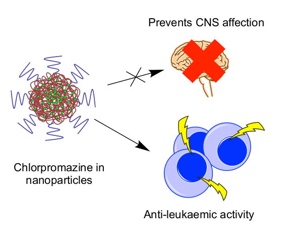Klorpromazin er eit antipsykotikum, men har synt seg å også vera effektivt mot leukemi. For at den skal kunna brukast i behandling av leukemi, må ein forsikra seg at legemiddelet ikkje kryssar blod-hjerne-barriæra. Ved å innkapsla klorpromazin i polymeriske nanopartiklar, unngår ein at legemiddelet akkumulerer i hjernen og gjer biverknader i sentralnervesystemet. Samstundes vil legemiddelet opphalda seg i nanopartiklar i blodet og beinmargen der kreftcellene er.