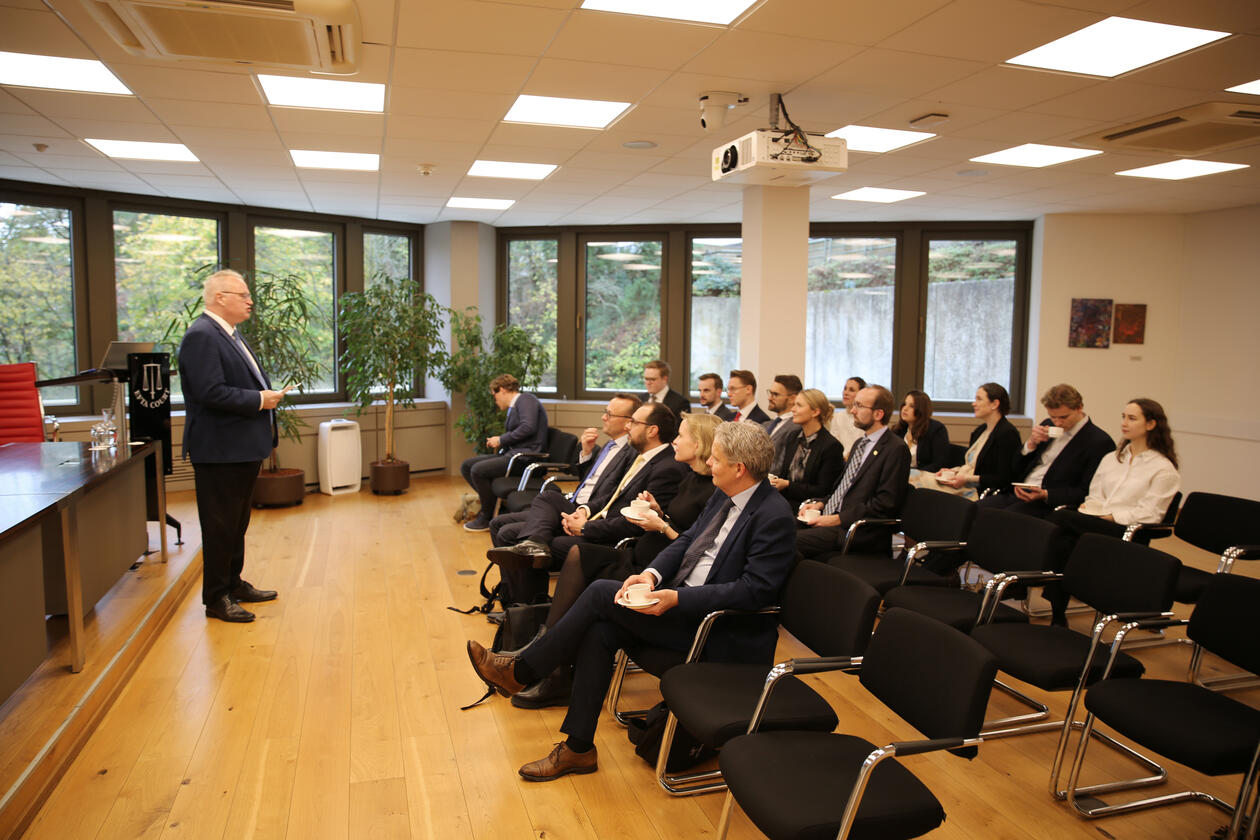 Neste dag stod eit besøk hjå EU-domstolen på programmet. Første post der var ei innføring i sak C-670/21 BA ved ein av praktikantane i domstolen. Saka omhandla spørsmålet om dei tyske reglane for verdifastsetjing av fast eigedom i tredjeland i samband med utrekning av arveavgift er i tråd med retten til fri flyt av kapital. Etter innføringa gjekk vi til domstolens største rettssal for å overvære ei munnleg høyring i saka. Dette gav eit verdifullt innblikk i korleis prosedyrane føregår i praksis, samt i den etterfølgjande utspørjinga frå dommarane og generaladvokaten si side. Utspørjinga leia til og med til ein EØS-rettsleg diskusjon mellom dommarane og partane. Etter den munnlege høyringa fekk vi ei omvising i domstolen. Under omvisinga kunne ein nyte domstolens arkitektur og vakre samling av kunst. Etter omvisinga samla vi oss i eit møterom for å samtale med dommar i EU-domstolen Siniša Rodin, og med dommar og visepresident i EU-domstolen Lars Bay Larsen. Desse vart også med vidare for å ete ein betre lunsj i ein av domstolens lunsjrom. Også dommar Jesper Svenningsen frå General Court var med på lunsjen. Då lunsjen var over tok vi følgje med Svenningsen til ein rettssal. Der haldt han eit innlegg om kva som rører seg i General Court.