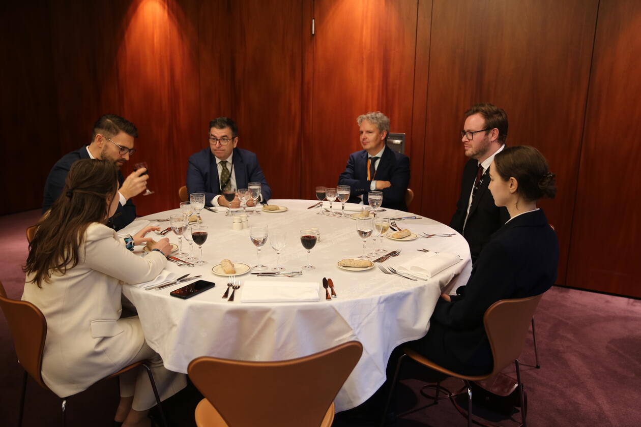 Etter Svenningsen sitt innlegg tok vi toget til Brussel. Der samla vi oss med ein gjeng frå ESA for ein framifrå middag på brasseriet Les Petits Oignons. Reisefølget fekk så kvilt seg litt før turen gjekk til ESA fredags morgon. Der vart vi tekne imot av mellom anna direktør for avdelinga Legal & Executive Affairs Melpo-Menie Joséphidès og legal adviser Erlend Leonhardsen. I tillegg var direktørane for avdelingane Internal Market Affairs og Competition and State Aid - høvesvis Jónína Sigrún Lárusdóttir og Harald Evensen - til stades. På programmet stod innlegg frå professorane Halvard Haukeland Fredriksen, Ronny Gjendemsjø og Christian Franklin, og førsteamanuensis Ingrid Barlund, om ulike tema som dei forskar på for tida. Etter desse innlegga haldt tilsette i ESA innlegg om ulike spanande saker som myndigheita arbeidar med for tida. Etter dette vart det lunsj saman med ESA, før reisefølget gjorde seg klare for heimreise.