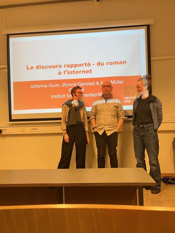 Lærernes dag ble arrangert i år igjen, fredag 31. januar 2025. Lærere fra hele Bergen tok turen til UiB. Fra fransk ved Institutt for fremmedspråk deltok stipendiat Johanna Gunn, førsteamanuensis Øyvind Gjerstad og førsteamanuensis Anje Müller Gjesdal med persentasjoner om noe av forskningsarbeidet som blir utført ved IF.