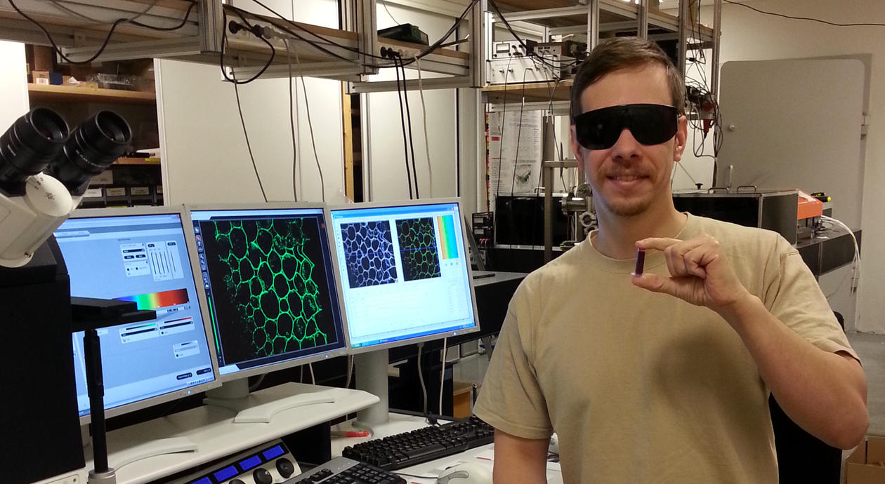 Stipendiat Arne Kristoffersen foretar levetidsmålinger av alger utsatt for ulike typer stress.