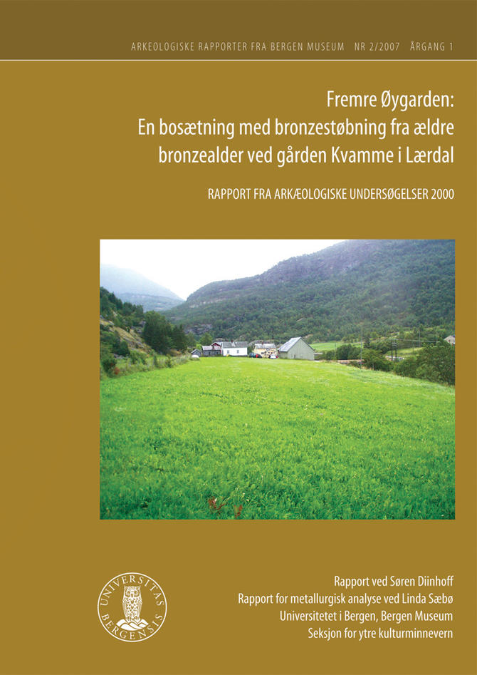 Fremre Øygarden: En bosætning med bronzestøpning fra ældre bronzealder ved gården Kvamme i Lærdal. Rapport fra arkeologiske undersøgelser 2000. Arkeologiske rapporter fra Bergen Museum nr 2/2007 Årgang 1. Universitetet i Bergen, Bergen Museum, Seksjon for ytre kulturminnevern. Rapport ved Søren Diinhoff. Rapport for metallurgisk analyse ved Linda Sæbø.