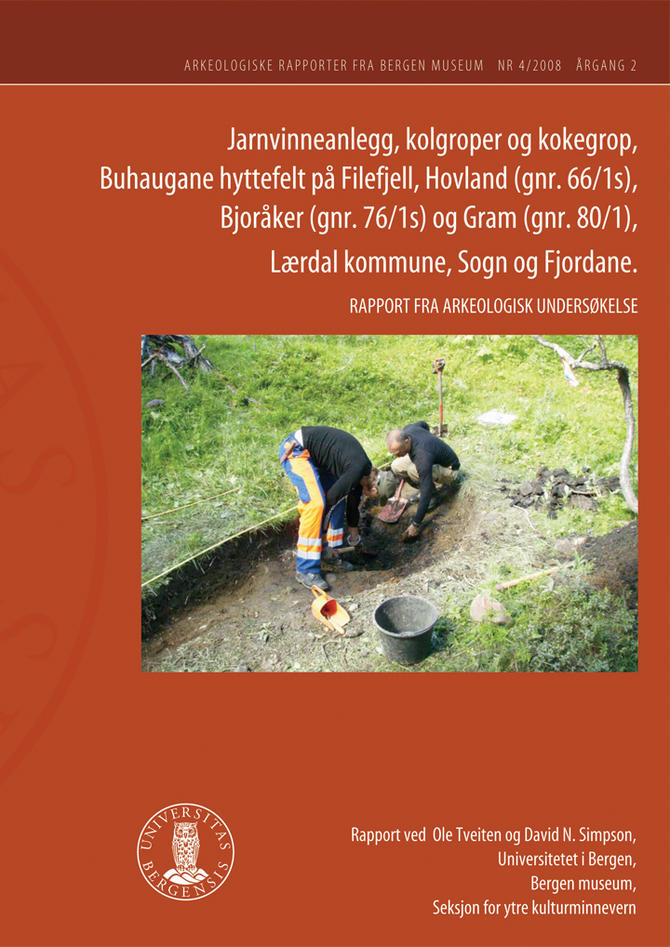 Jarnvinneanlegg, kolgroper og kokegrop, Buhaugane hyttefelt på Filefjell, Hovland (gnr. 66/1s), Bjoråker (gnr. 76/1S) og Gram (gnr. 80/1), Lærdal kommune, Sogn of Fjordane. Rapport fra arkeologisk undersøkelse. Arkeologisk rapporter fra Bergen Museum nr 4/2008 Årgang 2. Universitetet i Bergen, Bergen Museum, Seksjon for ytre kulturminnevern. Rapport ved Ole Tveiten og David N. Simpson