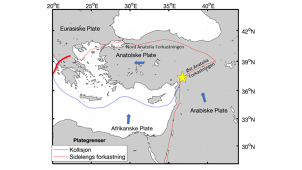 Jordskorpen er delt opp i en rekke større og mindre plater som beveger seg i forhold til hverandre. Det er på grensene mellom disse platene de største jordskjelvene skjer. Skjelvet 6. februar skjedde i et område der fire plater møtes og påvirker hverandre som vist i figur 1. Den Afrikanske platen beveger seg nordover og kolliderer med Eurasia. Samtidig beveger den Arabiske platen seg nordover, hvilket fører til at den Anatolske platen, som dekker det meste av Tyrkia, blir skvist vestover. Skjelvet skjedde langs Øst Anatolia Forkastningen som markerer den sørøstlige avgrensning av den Anatolske platen mot den arabiske platen.