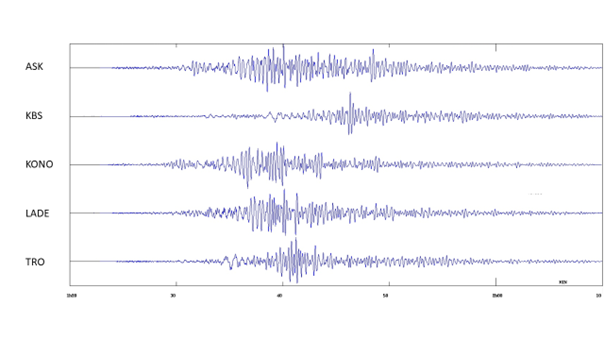 I Norge overvåker vi jordskjelv gjennom Norsk Nasjonalt Seismisk Nettverk (NNSN; www.skjelv.no) som ledes av Institutt for geovitenskap ved Universitetet i Bergen. Nettverket består av 42 seismiske stasjoner som er plassert så vi kan best mulig måle alle norske jordskjelv. Samtidig registrerer vi større jordskjelv som skjer rundt om i verden. Jordskjelvet 6. februar ble tydelig registrert over hele Norge der rystelsene ankom ca. 6 minutter etter skjelvet begynte i Tyrkia. Registreringer fra målestasjoner nær Bergen (ASK), Ny-Ålesund på Svalbard (KBS), Kongsberg (KONO), Trondheim (LADE) og Tromsø (TRO) kan sees i figur 2.