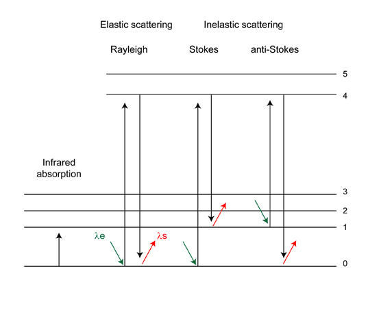 The Raman effect, named after Noble price winner Chandrasekhara Venkata Raman, can be described as an inelastic light scattering process. When a strong light source (laser) is focused on a substance most of this energy will be scattered elastically. In this case the molecules of the substance are excited to a virtual electronic state and immediately fall back to their original state by releasing a photon (see figure 1). The photon energy of this scattered light is equal to that of the incoming light. This process is called Rayleigh scattering. A molecule may also fall back from an excited electronic state to an energy state that is higher (Stokes type scattering) or lower (anti-Stokes type scattering) than the original state. The difference in energy between the incoming and scattered photon (Raman shift) corresponds to the energy difference between vibrational energy levels of the molecule. The different vibrational modes of a molecule can therefore be identified by recognizing Raman shifts (or ‘bands') in the inelastically scattered light spectrum.