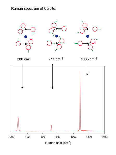 A wide variety of substances - minerals, organic molecules, fluids, gases - can be identified directly from their Raman spectrum. It should be noted that Raman scattering is effective for covalent bonds, and very weak for ionic bonds. The covalent bonding environment can be influenced by cation substitution in a mineral structure. An example for the mineral calcite is shown in figure 2, where Raman bands are generated by vibrational modes of the carbonate anion.