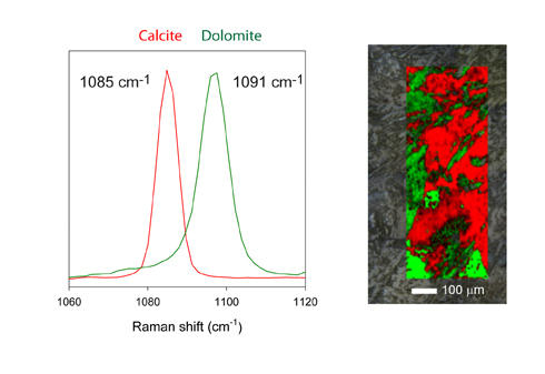 The substitution of Mg for Ca in the carbonate structure, e.g. dolomite, leads to an altered crystal structure and a shift of the main Raman band from 1085 to 1091 cm-1. This difference in Raman shift can be mapped in a rock thinsection, as shown in figure 3.