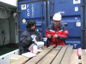 Når prøven er på land er forskeren klar til å studere den. Først må en sette på et lokk i begge ender av røret, deretter blir det saget opp i biter som er 1,5 meter lange, og så sages disse i to på langs. Da kommer sedimentene til syne, og vi kan se en fin lagdeling. Det første som gjøres nå er at sedimentene beskrives, farge, kornstørrelse, om det er små steiner i dem osv. Deretter blir det satt på et målbånd slik at man vet nøyaktig hvor dypt de ulike lagene har ligget, og kjernene blir fotografert.