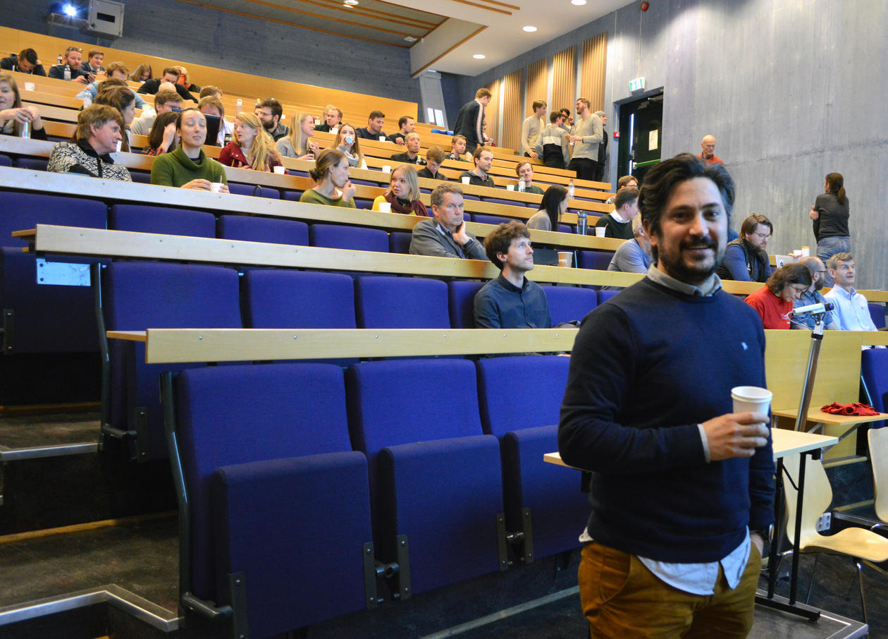 Instituttet stilte også sterkt med foredragsholdere som er tilknyttet instituttet i dag. Både Sindre Eikenes og Ole-Gunnar Skjolddal viste foreløpige resultater fra sine masterprosjekter og ga dermed tilhørerne et godt innblikk i hvordan satellittbilder og romlig eksplisitt modellering kan brukes til å studere geofarer og mulige effekter nedstrøms av hhv ekstremnedbør i Bergen og isbresmelting i Bhutan. Også Max Koller fokuserte på geofarer, og hvordan detaljerte terrengmodeller kan brukes til å visualisere før- og etter- situasjonen etter flom, og dermed gi økt kunnskap om selve flomprosessen. Max var også stand-in for Benjamin Robson og presenterte det pågående FALK-prosjektet, der satellittbilder brukes for å oppdatere hovedøkosystemklassifiseringen av Norge. Prosjektet er i regi av Miljødirektoratet som for tiden jobber med å integrere og evaluere fjernmålingsbaserte datasett for naturtyper i Norge.