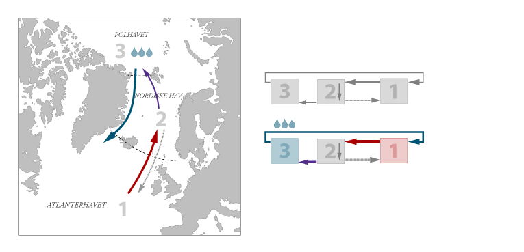 To tredjedeler av vannet som kommer inn i De nordiske hav strømmer sørover igjen i dypet. Den siste tredjedelen fortsetter videre nordover og inn i Polhavet. Dette vannet er ikke med i Stommels modell, og for at man skal kunne beregne hva som skjer når klimaet endrer seg, må det være det. Den gamle modellen har en boks for den sørlige delen av Nord-Atlanteren og en for De nordiske hav. Nå trenger vi en ny: Polhavet.