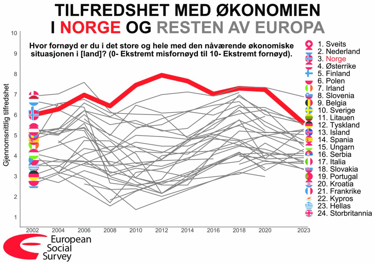 ESS-grafene viser at de fleste europeiske land opplevde en nedgang i tilfredsheten med økonomien fra 2018 til 2020, som var starten på koronapandemien. Denne nedgangen var imidlertid mindre markant i Norge og Sveits, mens Norge derimot opplevde en større nedgang fra 2020 til 2023.