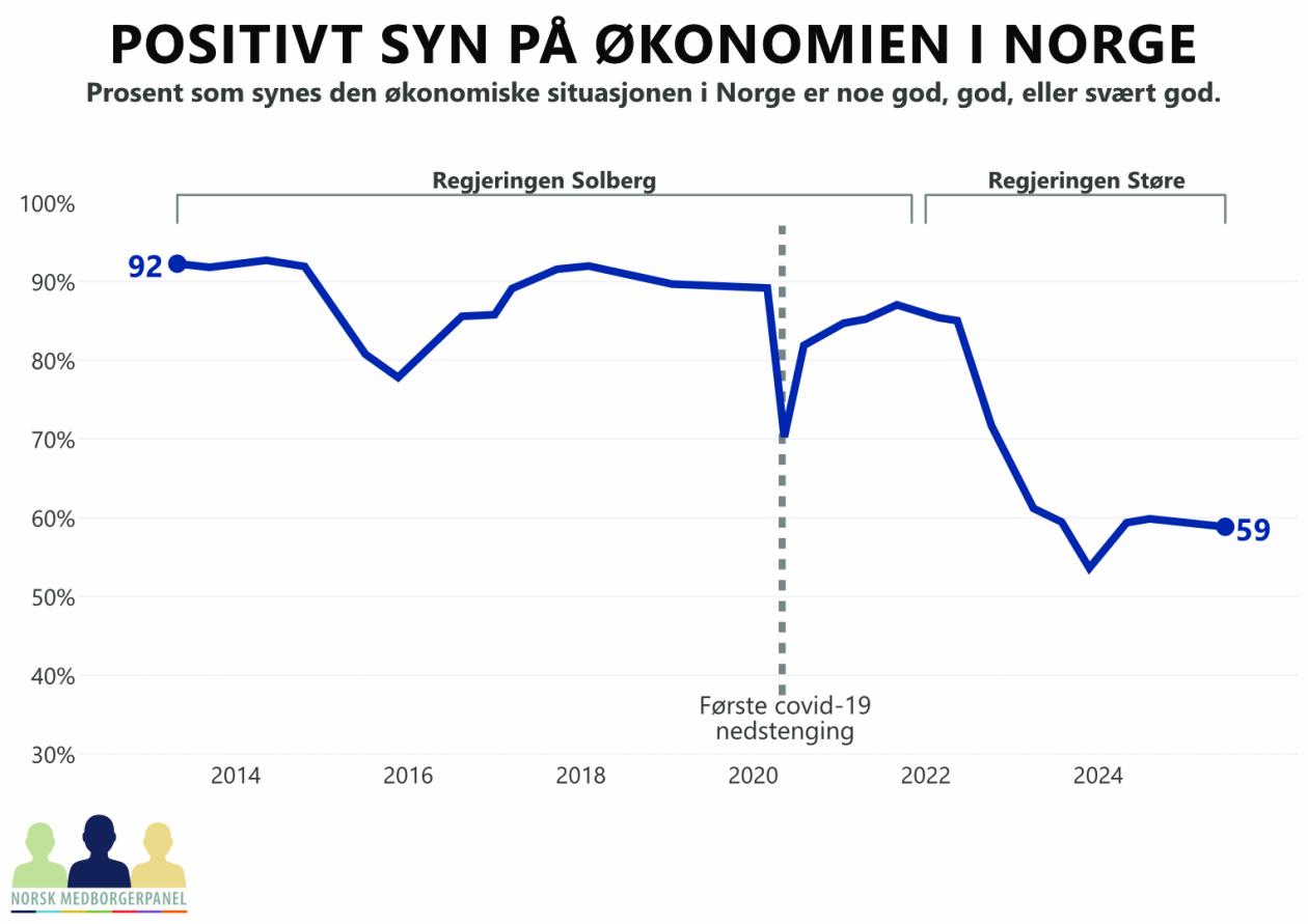 I årene etter koronapandemien ser man imidlertid at både tilfredsheten med økonomien og regjeringen daler, før de begynner å stabilisere seg det siste året. Førsteamanuensis ved Institutt for Politikk og forvaltning, Åsta Dyrnes Nordø, forklarer at nedgangen i tilfredshet delvis skyldes økte renter og generell prisvekst som begge bidrar til at flere opplever å ha en trangere økonomi.