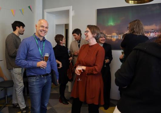 Viserektor ved UiB, Gottfried Greve (til venstre) og områdedirektør Benedicte Løseth (til høyre) fra forskningsrådet og, er fornøyd med dagen. KODEM og ESS Norge er begge finansiert av forskningsrådet.