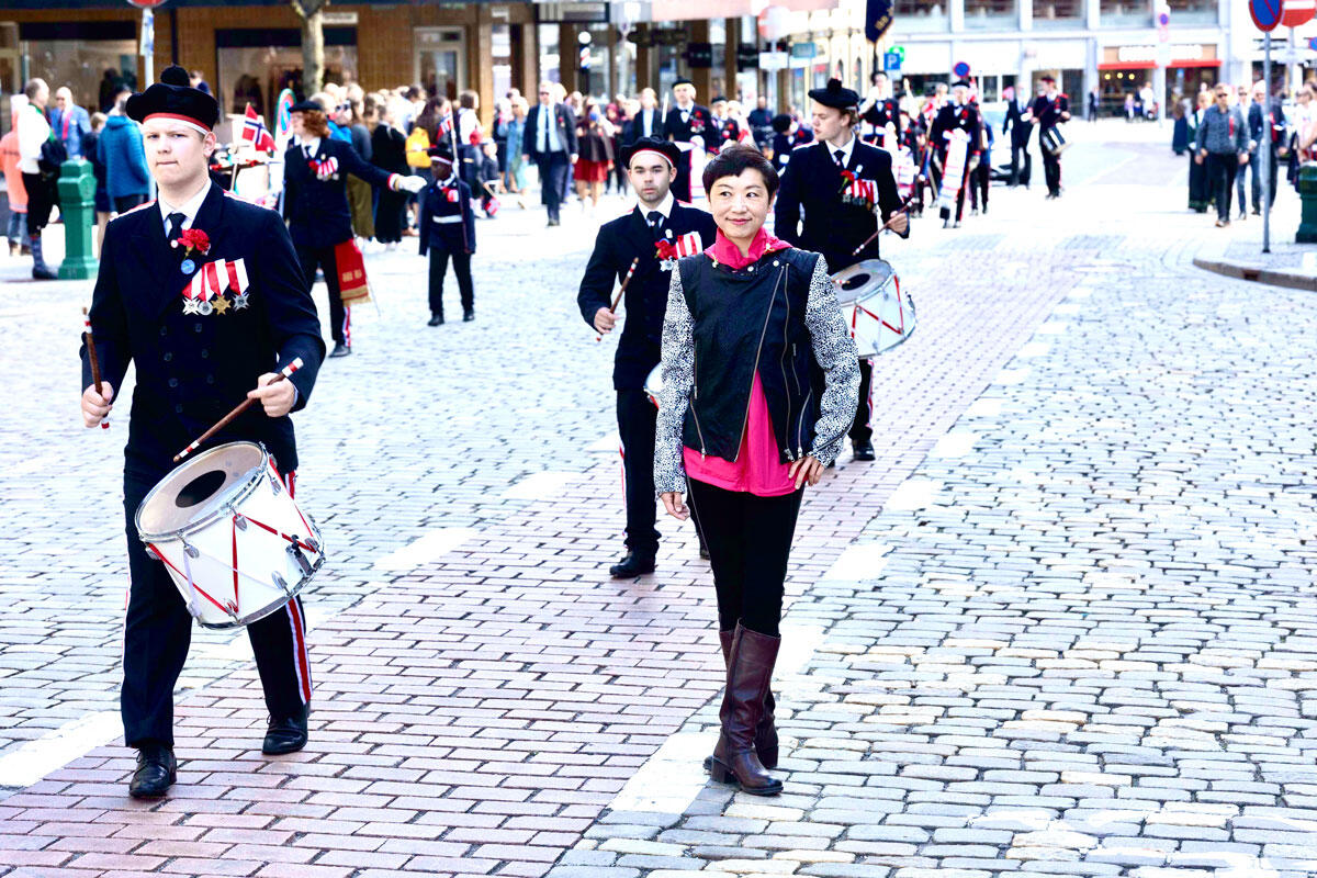 Huiwen (Helen) Zhang i bergenske gater på nasjonaldagen 2021, her fotografert sammen med et buekorps.