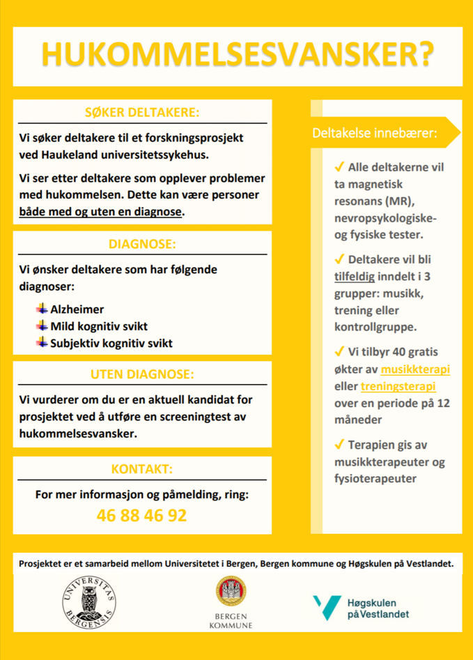 Vi søker dermed deltakere både med og uten en diagnose. Vi ser etter deltakere med mild kognitiv svikt, Alzheimer sykdom, eller deltakere som opplever hukommelsesvansker uten en kjent årsak. Dette vil si personer uten vaskulære sykdommer eller en historie innen psykiatrien. Hvis man ikke har en diagnose vurderer vi om man er en aktuell kandidat for prosjektet ved å utføre en screeningtest av hukommelsesvansker.