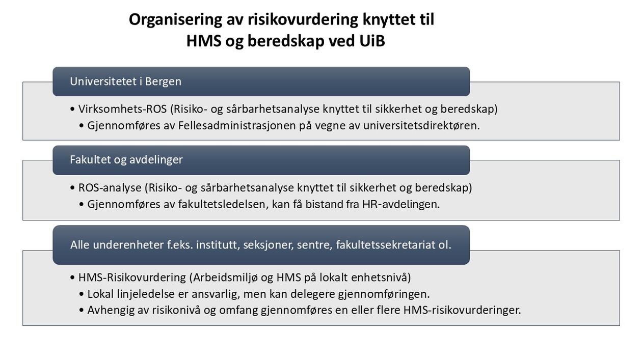 Bildet under gir en visuell fremstilling av organiseringen av risikovurdering knyttet til HMS og beredskap ved UiB.