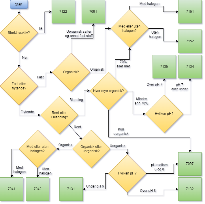 Her er et flytskjema som kan være til hjelp for klassifisering av farlig avfall. Flytskjemaet inneholder de mest vanlige avfallsstoffnumrene til bruk på laboratorie, men fullstendig oversikt finner du i lenken over. OBS! Det er oppdaget feil i skjema, så ta en dobbelsjekk mot fullstendig oversikt (se lenker rett over her) om du er usikker.