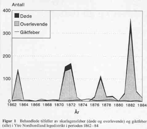 I 1987/88 opplevet Norge og flere andre vestlige land en oppblomstring av alvorlige streptokokkinfeksjoner. I motsetning til i USA ble det i Norge ikke observert øket forekomst av giktfeber samtidig. Hensikten med denne studien var å undersøke forekomsten av skarlagensfeber og giktfeber i Ytre Nordhordland legedistrikt (omkring 15 000 innbyggere) i perioden 1862-1884. I denne perioden forekom det fire epidemier med alvorlig skarlagensfeber i Ytre Nordhordland. Ialt ble det behandlet 1155 pasienter (96% barn), hvorav 154 døde (13,3%). Glomerulonefritt med påfølgende nyresvikt synes å ha vært en viktig dødsårsak. I samme periode ble det behandlet 76 pasienter (96% voksne) for giktfeber. Det var ingen sammenheng mellom forekomsten av skarlagensfeber og giktfeber. Dette tyder på at glomerulonefritt og giktfeber ble forårsaket av to ulike streptokokkstammer. Det er sannsynlig at det i tillegg til den aggressive skarlagensfeberen hersket en mer benign "Angina tonsillaris" som kan ha forårsaket giktfeber i enkelte tilfeller. Artikkelen er skrevet av Hogne Sandvik og er tidligere publisert i Tidsskrift for Den norske lægeforening 1992; 112: 3803-5.