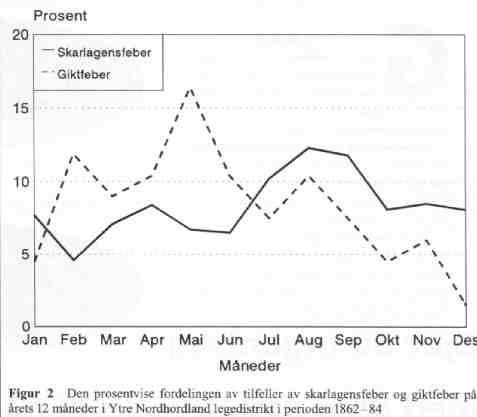 Som det fremgår av figur 1 var det ingen sammenheng mellom hyppigheten av skarlagensfeber og hyppigheten av giktfeber. Ialt ble det behandlet 76 pasienter for giktfeber, hvorav 96% var over 15 år. Det høyeste antall behandlede (ti) var i 1875, et år hvor det ikke ble registrert noen tilfeller av skarlagensfeber. Den relative hyppigheten av skarlagensfeber var størst om høsten, mens giktfeber var hyppigst om våren (fig 2). Heller ikke i de utfyllende kommentarene er det noe som tyder på at man har sett noen sammenheng mellom giktfeber og skarlagensfeber.