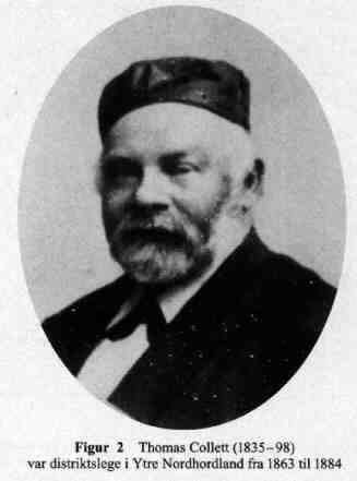 I Norge var det distriktslegene rundt Bergen som sterkest hevdet smitteteorien (2). I 1865 argumenterte distriktslege Thomas Collett (1835-98) (fig 2) overbevisende for dette synet. Han kunne påvise smitteoverføring i hvert eneste tilfelle: "Min Mening er altsaa at Nervefeber her paa Vestlandet alene udbreder sig ved et Contagium ... Smittestoffets Sæde, ligesom Maaden hvorpaa det overføres fra den ene til den andre, er mangfoldig, blandt andet ogsaa gjennem den Syges Secreter og Udtømmelser" (7).