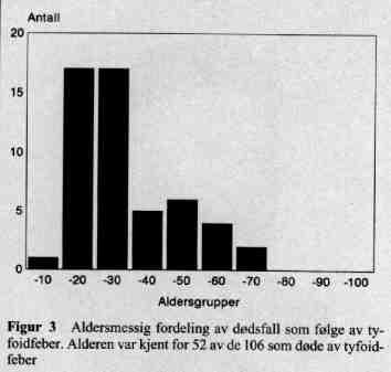 I perioden 1854-83 ble det registrert 1900 sykdomstilfeller og 106 dødsfall av tyfoidfeber i Ytre Nordhordland. Ialt 1011 ble registrert med kjønn, aldersgruppe og tidspunkt (måned). Blant disse var 519 (51%) kvinner og 492 (49%) menn, 246 (24%) under 15 år og 765 (76%) eldre.