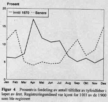 Før 1870 peker april seg ut som måneden med flest sykdomstilfeller. De neste månedene avtok hyppigheten gradvis. Det kan se ut som det skjedde en betydelig smitteimport i april, med ytterligere spredning av sykdommen de påfølgende månedene. Dette mønsteret avviker fra det som var vanlig ellers i landet, hvor man så flest tilfeller av tyfoidfeber om vinteren (2). Etter 1870 var imidlertid sykdomstilfellene i Ytre Nordhordland også konsentrert om den kalde årstiden (fig 4).