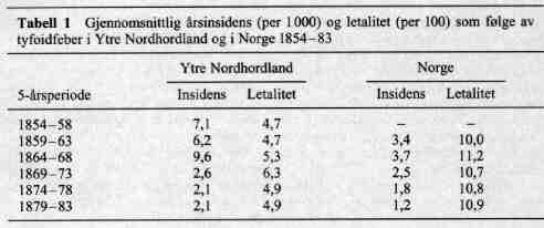 For perioden 1854 til 1883 er det beregnet insidens og letalitet av tyfoidfeber i Ytre Nordhordland. Tilsvarende beregninger er gjort for hele Norge for perioden 1859 til 1883 (2, 12). Tallene er angitt som årsgjennomsnitt for hver femårs-periode.