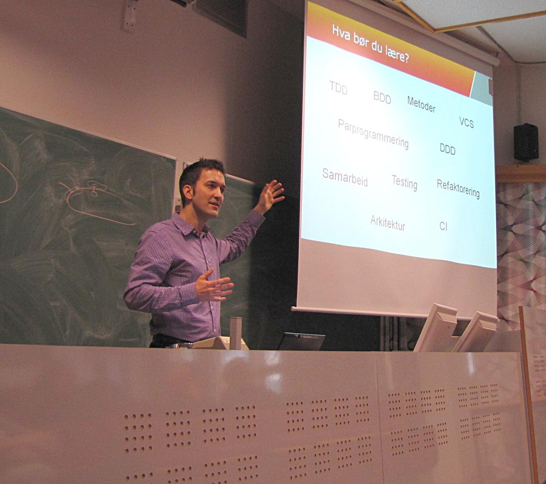 – Generelt ser vi ikke så mye forskjell på hvor konsulentene har sin utdannelse fra, svarer Olsen på spørsmål fra salen, og skuffer nok en og annen professor. – Men det er kanskje fordi vi plukker de beste kandidatene, og de jobber nok uansett mye med programmering på egenhånd ved siden av utdanningen.