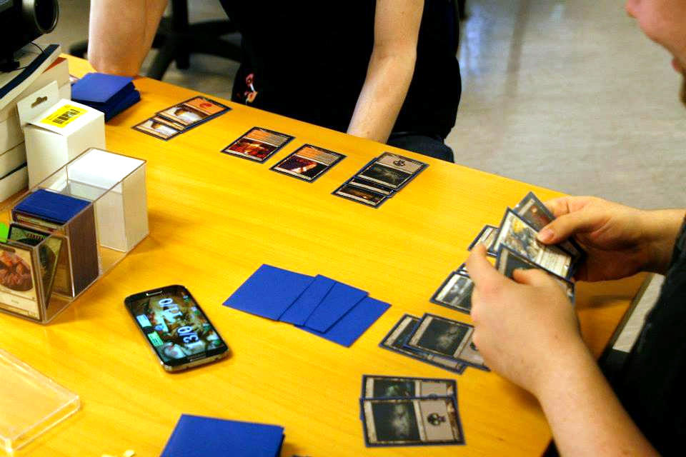 På lesesalen er bordene dekket av ledninger, kretskort og loddeutstyr, elevene sitter rundt i mindre grupper eller alene, og eksperimenterer med hva de kan få til med det tilgjengelige utstyret.