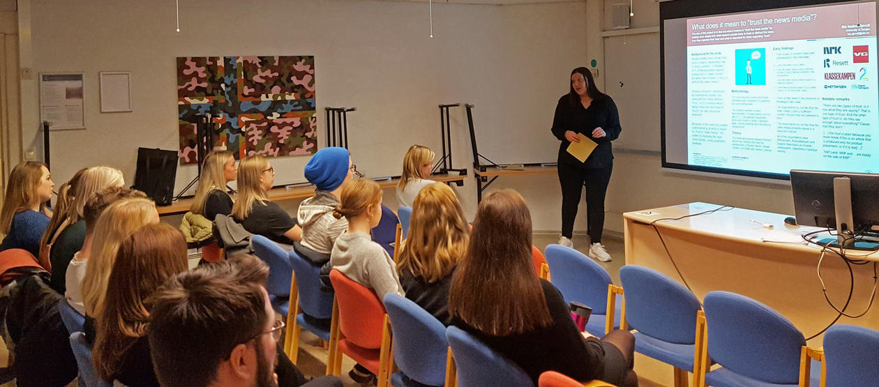 En av studentene som presenterte sin oppgave var Bia Sjøvoll. Sjøvoll skriver om tillit til nyheter, og ønsker å finne ut av hva det egentlig betyr at 48 % av befolkningen ikke har tillit til mediene. Derfor har hun valgt å ha en kvalitativ tilnærming, hvor all forskning tidligere har vært kvantitativ. Sjøvoll skal ha 15 intervjuer for å komme til bunns i hva greia er med tillit til mediene.