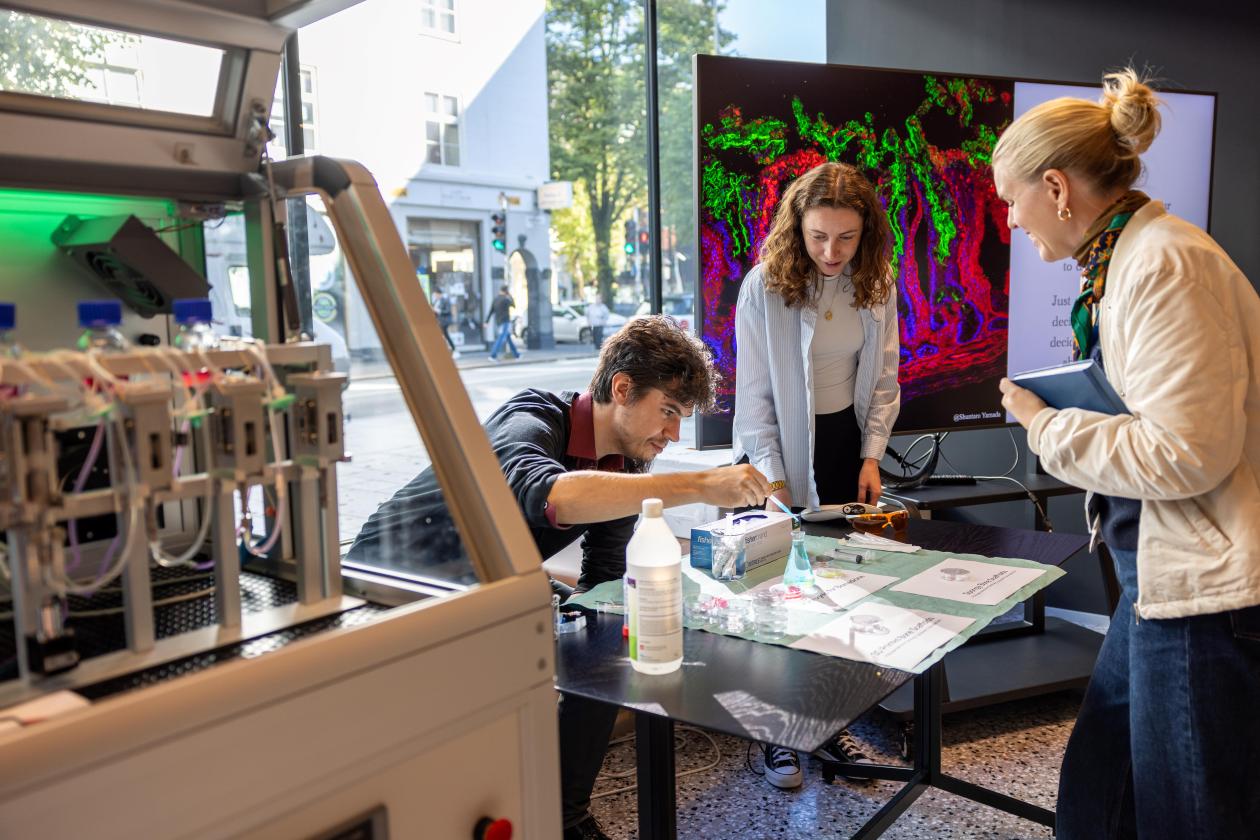 UiB inviterer for andre gang til innovasjonsdag! Bildet er fra fjorårets arrangement, og standen til forskningsgruppen "Styrt vevsbygging og regenerasjon" ved Institutt for klinisk odontologi, hvor man kunne få innblikk i arbeidet med en ny 3D-printer for benregenerering.