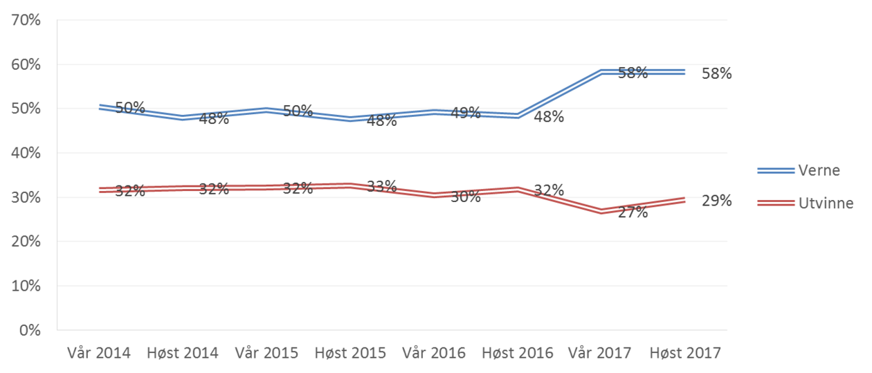 Medborgerpanelets funn viser at det er Nord-Norge som er mest interessert i vern av disse områdene, der hele 7 av 10 innbyggere ønsker å verne heller enn utvinne. Trøndere og Oslo/Akerhus er like bak.