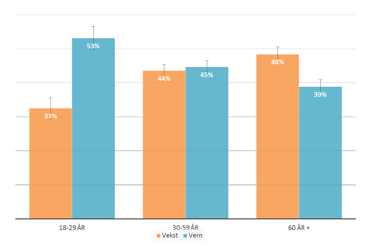 Funnene viser at selv om spørsmålet om hva som veier tyngst av miljøinteresser eller vekst gjennom industriutbygging fordeler seg ganske likt i befolkningen generelt, så er det forskjeller når man skiller tallene på alder og utdanningsnivå.