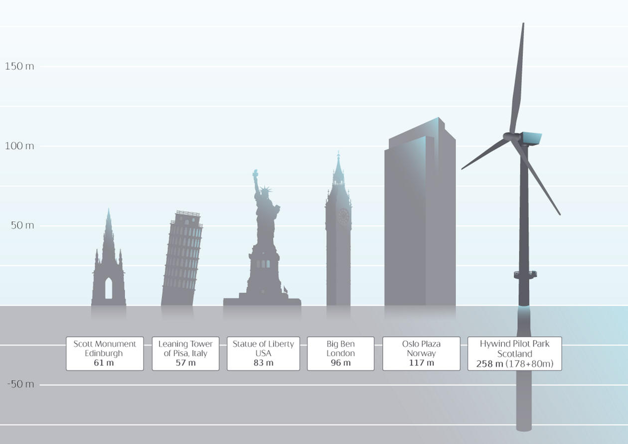 STORE MØLLER: Flytande vindkraft er ikkje småtteri. Denne illustrasjonen laga av Equinor viser turbinane i Hywind pilot-park utafor Skottland samanlikna med andre bygg.