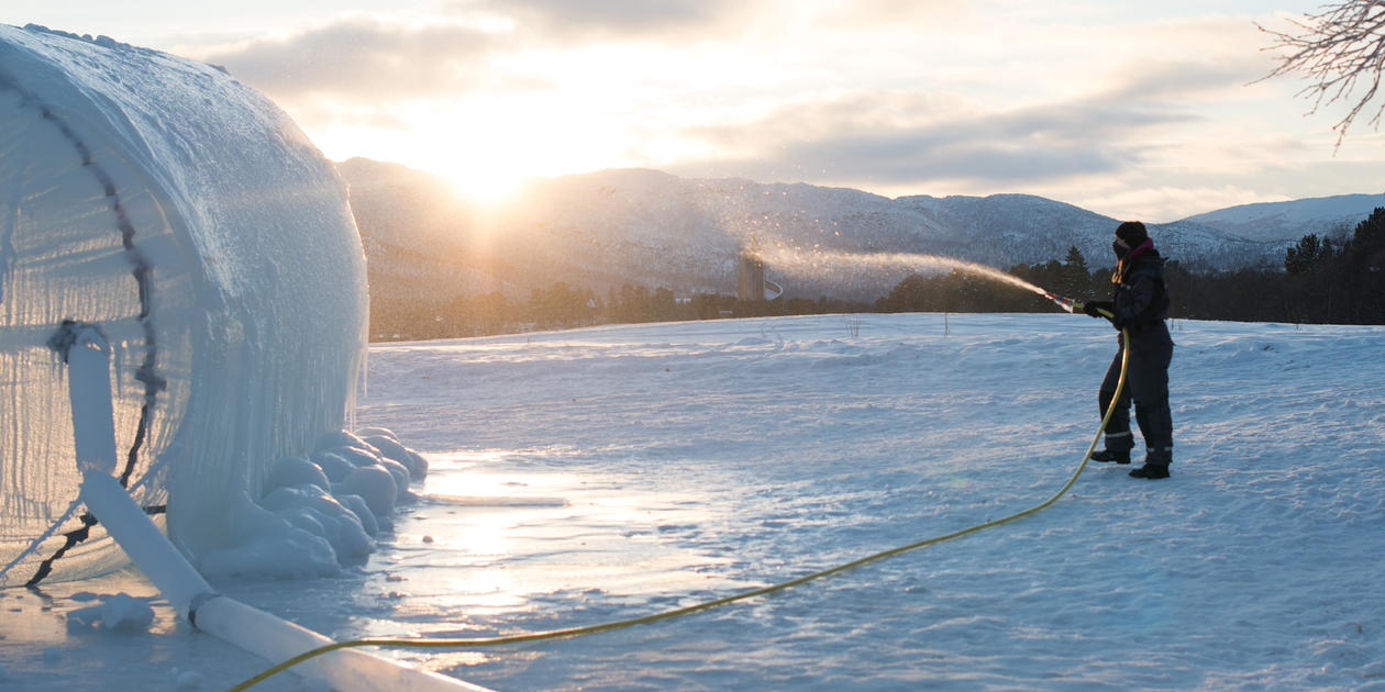 Studenter og ansatte fra Fakultet for kunst, musikk og design deltar på Ice Music Festival på Geilo med isinstrumenter og en fantasilandsby bygget av is.