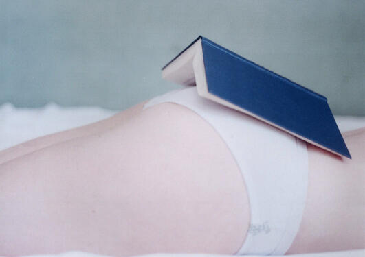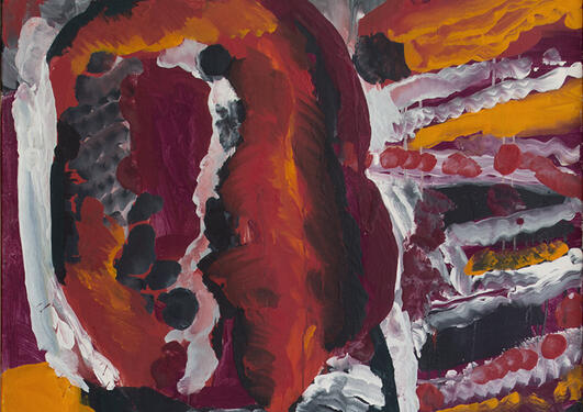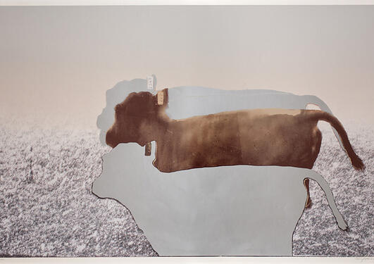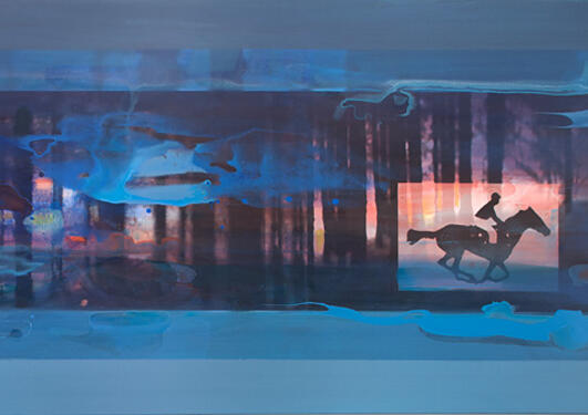 Tre hoder stirrer mot oss fra billedflaten. Det midterste tilhører et menneske, en rytter, som sitter på en dyrerygg. Ryggen buer seg opp på hver side, til de to andre hodene. Det ene hodet er et hestedyr, det andre ser mest ut som en fugl. De deler den samme, ene ryggen, og har hvert sitt synlige...