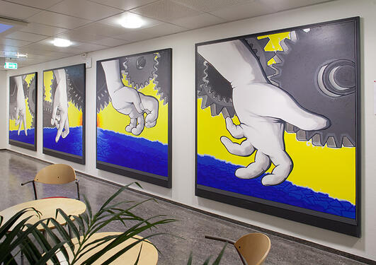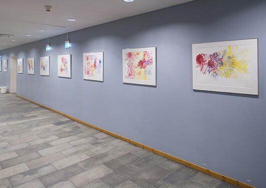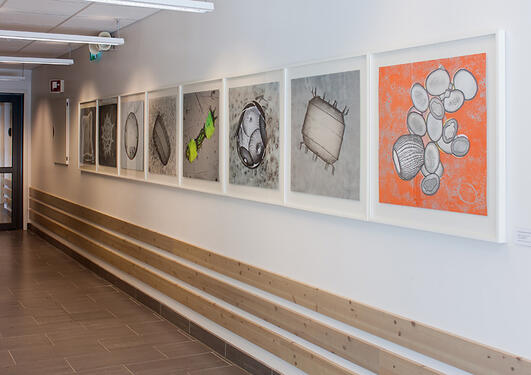 Ved informasjonen i SV-bygget henger sytten små trykk på stoff, innrammet i glass. Motivene, kjente tenkere, er piksellerte, bygget opp av runde flekker som er tettere i enkelte områder. På avstand ser det ut som sort/hvitt-fotografier, men om vi går nærmere, oppløses bildene til en abstrakt,...