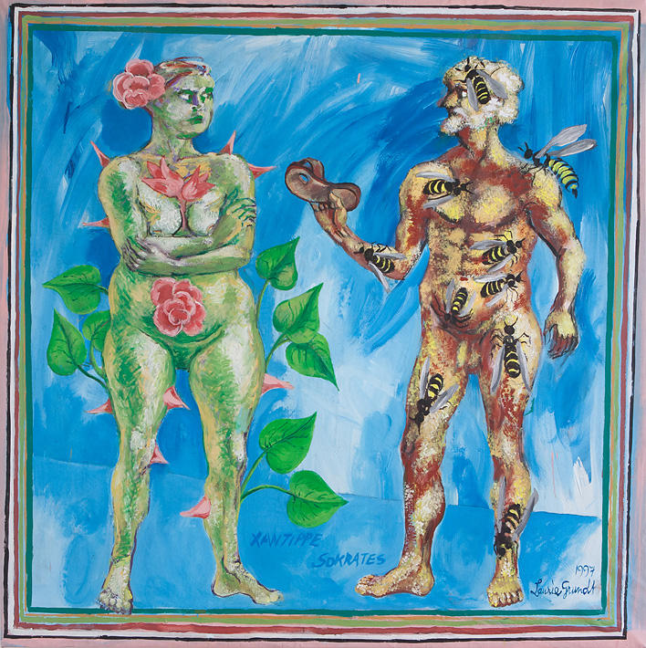 Xantippe var kjent for sitt hissige gemytt, og det sies at hun var den eneste som noen gang vant en diskusjon med Sokrates. I Grundts fremstilling av de to er det ikke vanskelig å tro; hennes torner er uten tvil mer fryktinngytende enn biene til Sokrates.