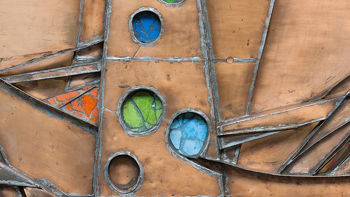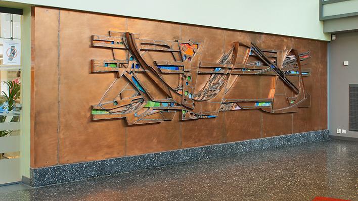 Else Hagens veggkunst har ikke et klart motiv, fargene er i fokus. De aksentueres av dybdeforskjellene i kobberrelieffet.