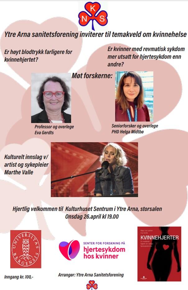 Senteret fortsetter sitt gode samarbeid med sanitetskvinnene. Både professor Eva Gerdts og seniorforsker Helga Midtbø deltar med foredrag på Ytre Arnas Sanitetetsforenings temakveld om kvinnehelse 26.04.23