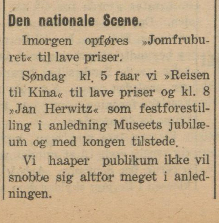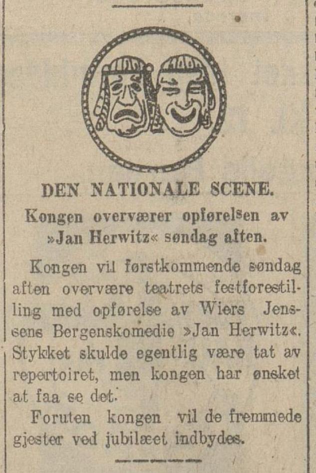 Studenter på teatervitenskap har i vår samarbeidet med teaterarkivet om festforestillingen «Jan Herwitz – Gamle Bergensbilleder». Komedien er skrevet av Hans Wiers-Jenssen, og ble satt opp på Den Nationale Scene i anledning Universitetsmuseets 100-årsjubileum i 1925. Stykket ble ansett som «erkebergensk», og skildret Bergen i 1830-årene, tiden rundt museets grunnleggelse. Museets grunnlegger, Wilhelm Frimann Koren Christie, opptrer også som karakter i stykket
