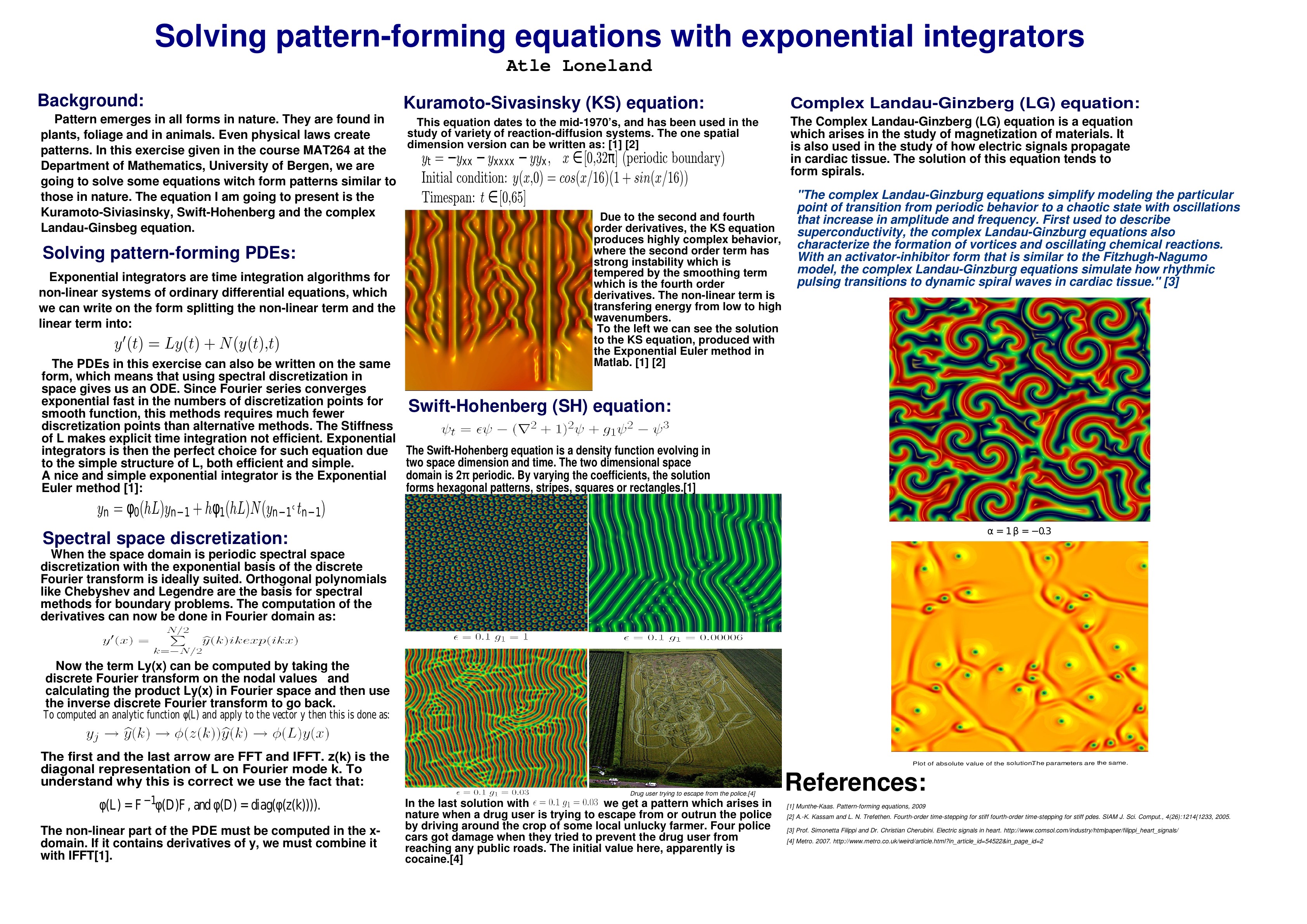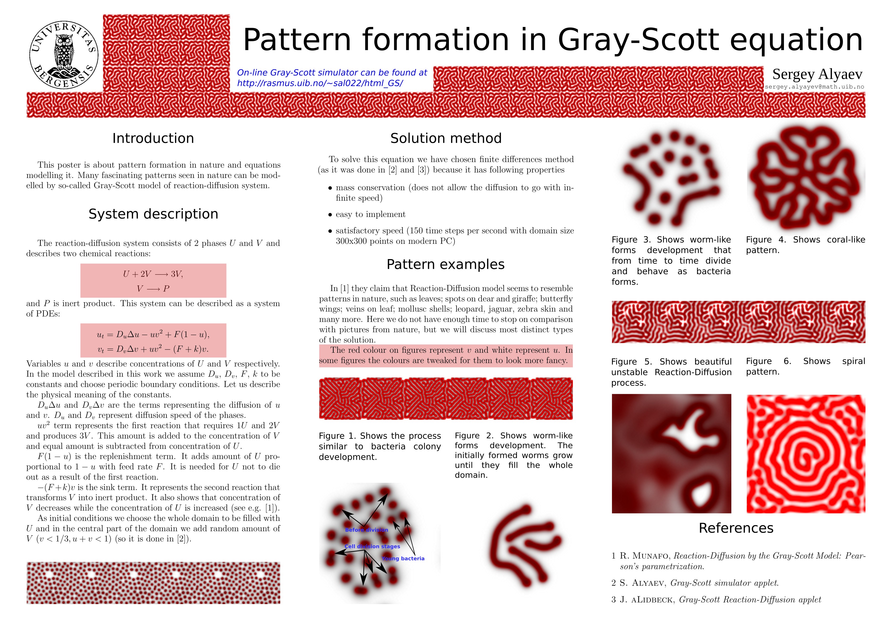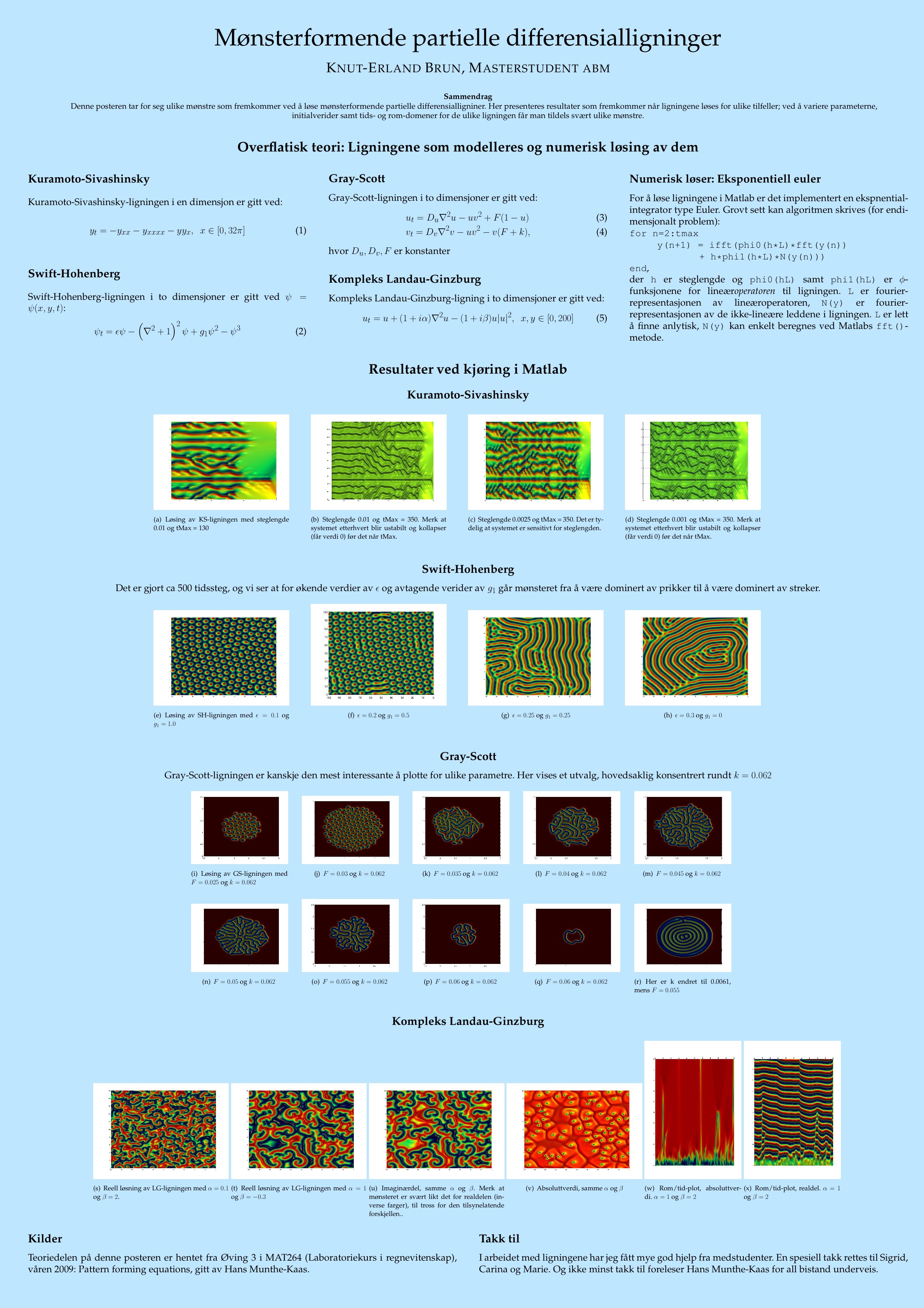 Oppgaven var å skrive numeriske løsere for utvalgte klasser av "Pattern forming PDEs". Foruten programkodene, skulle prosjetet avsluttes med plakater som ble presentert ved 60 års jubileums konferansen for Matematisk Institutt 8. mai. Studentene stod helt fritt til å utforme innholdet i plakatene, og de valgte ulike tilnærmelser til oppgaven.