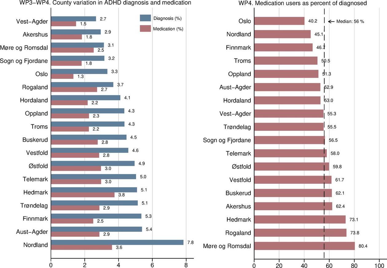 ADHD-diagnose hos barn settes i psykisk helsevern for barn og unge, ofte kalt BUP, der barnet bor. Statistikk fra BUP-ene viser at Nordland har en mye høyere forekomst av diagnoser enn for eksempel Oslo, Akershus og Vest-Agder. Også når det gjelder legemiddelbehandling er det store forskjeller. Mens det i Oslo gis slik behandling til 40 prosent av dem som får diagnosen, behandler Møre og Romsdal 80 prosent. Tallene gjelder barn i alderen fem til 18 år (se tabell).